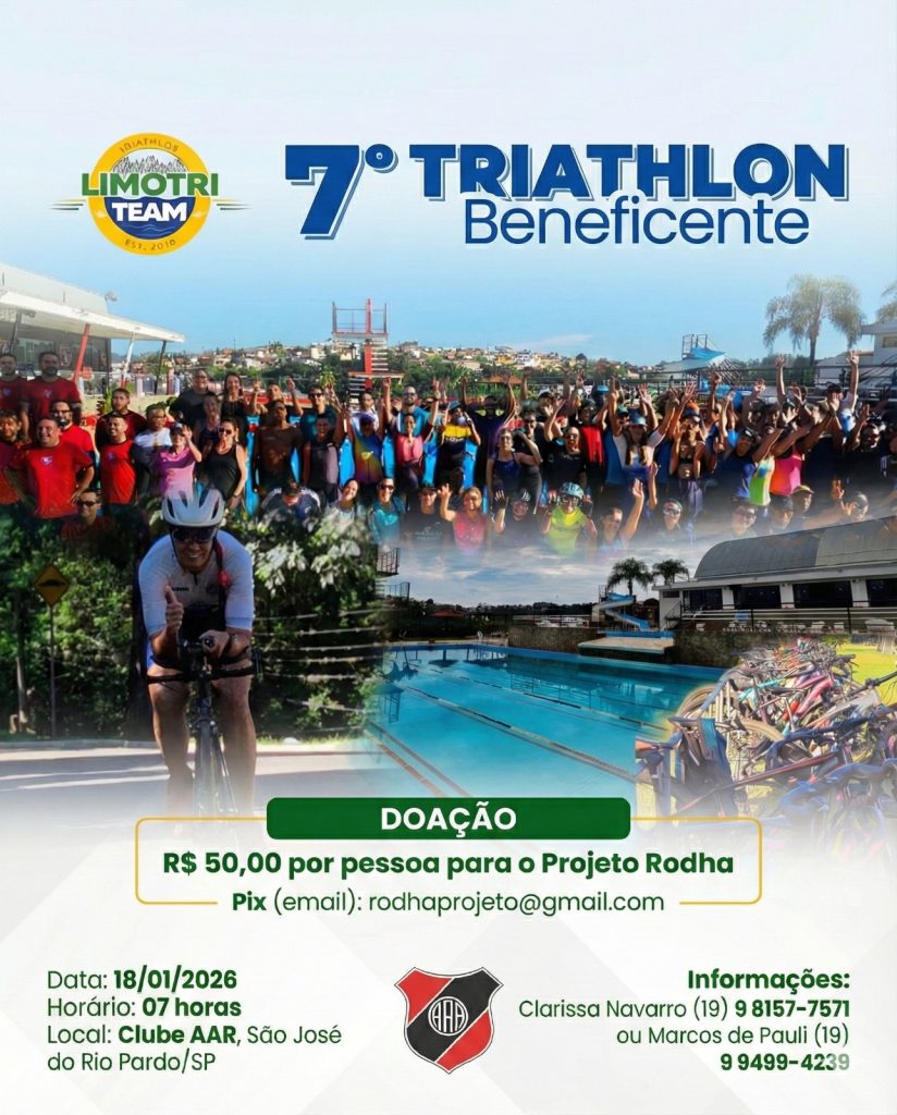 O esporte rio-pardense já inicia 2026 com força total e em benefício a um Projeto muito especial. O Limotri Team está organizando e promoverá domingo, dia 18/01, a partir das 7h00, o 7º Triathlon Beneficente, que nesta edição será em prol do “Rodha”, que proporciona bolsas de estudo ao Ensino Médio para alunos que se destacam nas escolas públicas, conforme seleção e avaliação prévias.