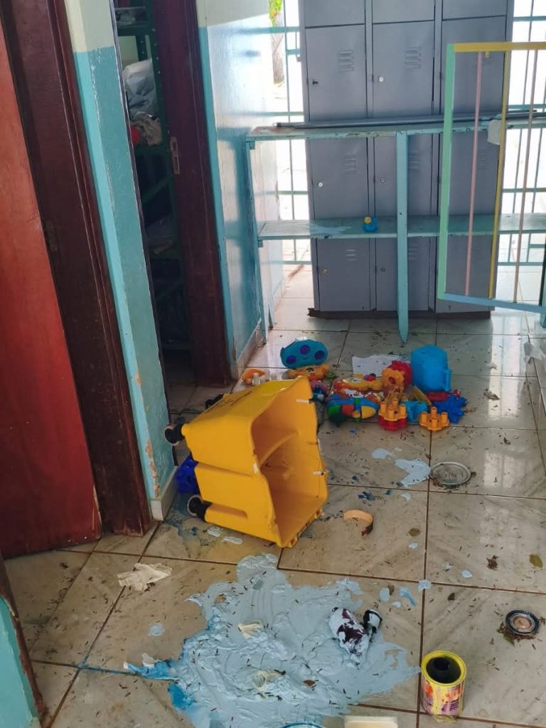 Nesta imagem, divulgada pelas redes sociais, dá para notar os atos de vandalismo no interior da EMEB Maria França Torres