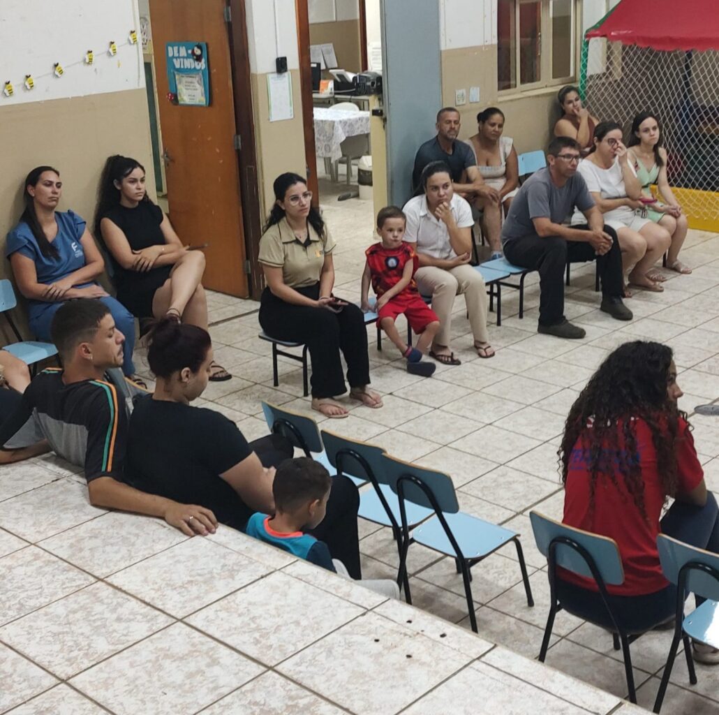 Pais, familiares e professores atentos durante reunião na EMEB Vinício Spessotto