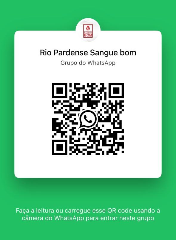 Para quem quiser participar do grupo Rio-Pardense Sangue Bom pode entrar em contato pelo link https://chat.whatsapp.com/CuefGSHRzyVFortANwxYjv?mode=wwt ou também pelo QR code abaixo. Neste Grupo os participantes também são orientados sobre a Campanha e os agendamentos às doações.