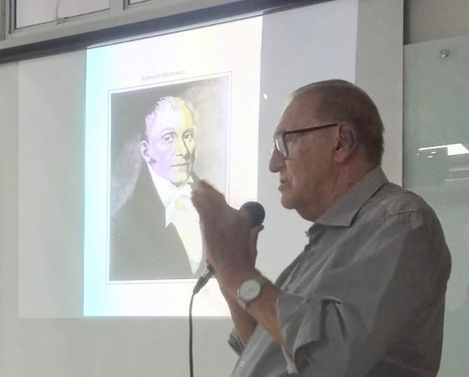 Durante a palestra, o médico destacou um pouco da história da Medicina na Ginecologia e os caminhos que levaram às evoluções nas cirurgias, em uma curva histórica desde 1809, onde destacou o Dr. Ephraim McDowel, que realizou a primeira cirurgia ginecológica à retirada de ovário em uma paciente nos EUA, passando por doenças infecciosas e inflamatórias, citando grandes nomes também da anestesiologia, cirurgiões que revolucionaram o tratamento do câncer, como Umberto Veronesi, pioneiro em cirurgia conservadora de mama, até chegar às grandes mudanças estruturais, como a criação da mesa cirúrgica, a importância da desinfecção das mãos e instrumentos cirúrgicos, bem como a descoberta da Penicilina, citando a importante contribuição dos antibióticos à manutenção e salvamento de vidas.