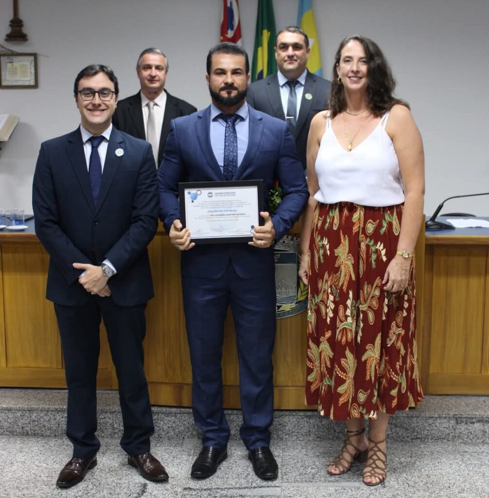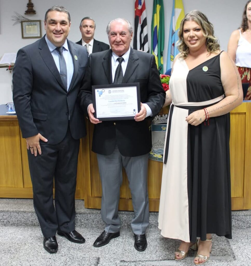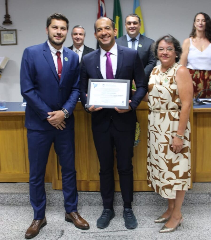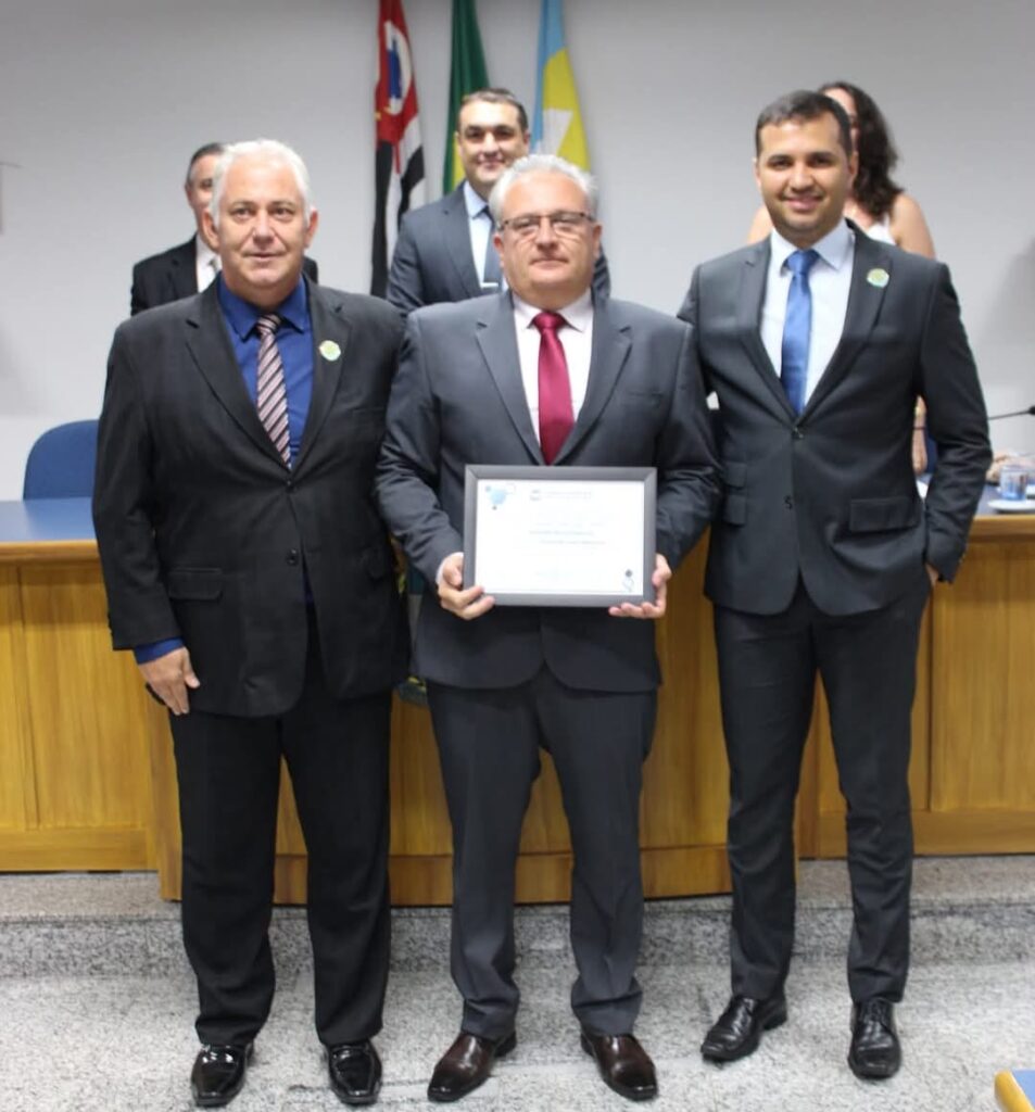 Dr. Wyl recebendo a honraria, que foi entregue pelo vereador Rubens Lobato Pinheiro Neto e pela Dra. Evelise Fagiolo Augusto