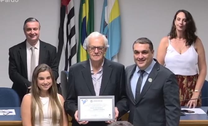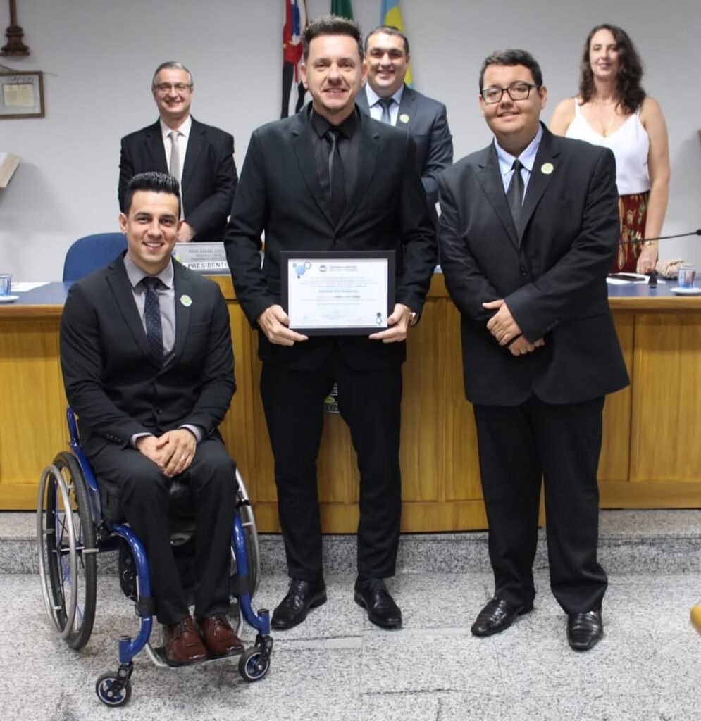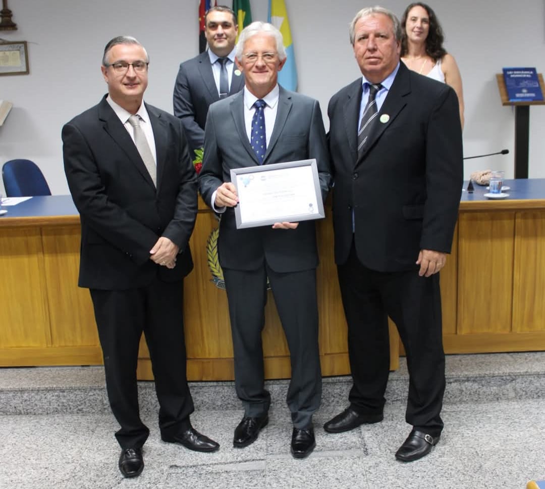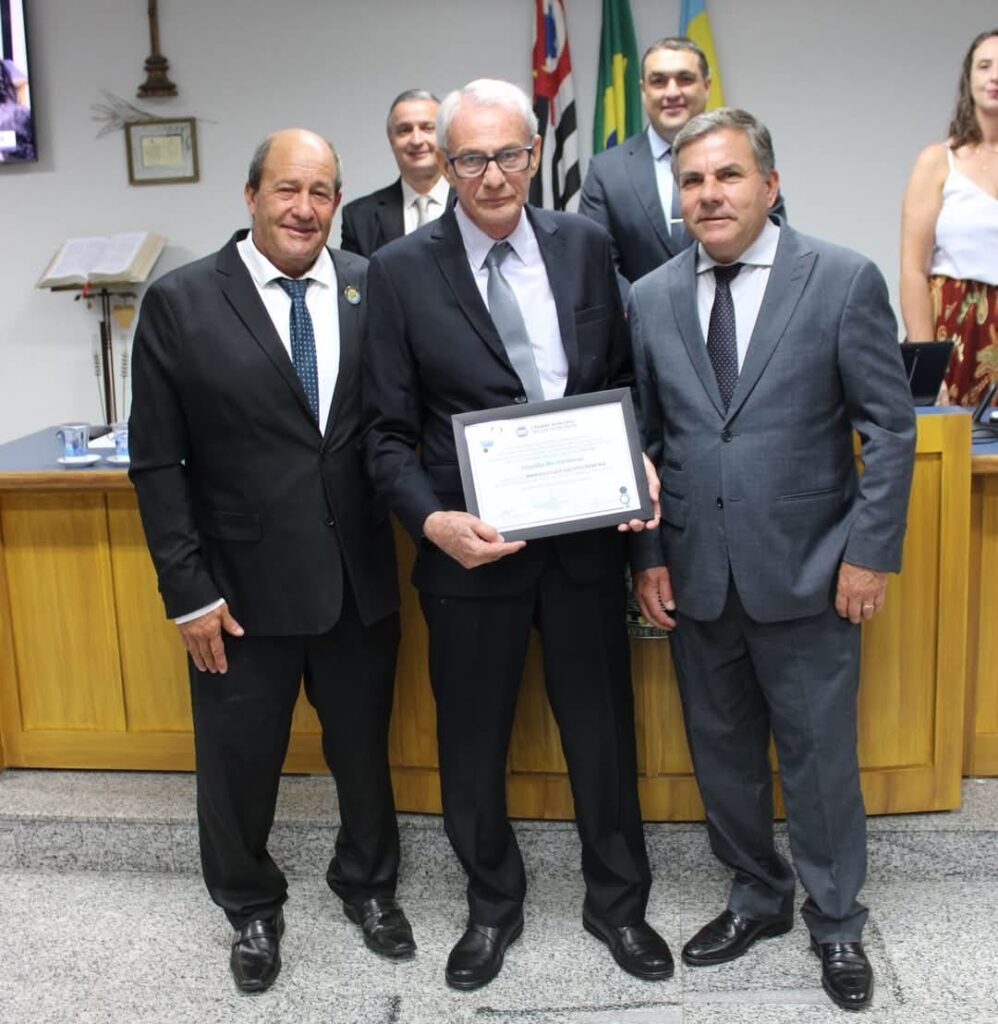 Dr. Wyl recebendo a honraria, que foi entregue pelo vereador Rubens Lobato Pinheiro Neto e pela Dra. Evelise Fagiolo Augusto