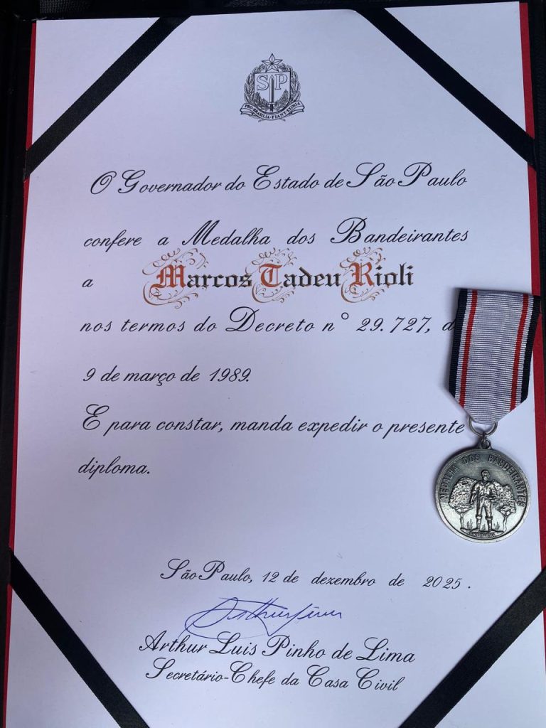 O rio-pardense e Promotor de Justiça Dr. Marcos Tadeu Rioli foi condecorado pelo Governador Tarcísio de Freitas com a “Medalha Bandeirante”, uma manifestação em agradecimento ao Ministério Público do Estado de São Paulo pelo comprometimento no enfrentamento às facções criminosas.