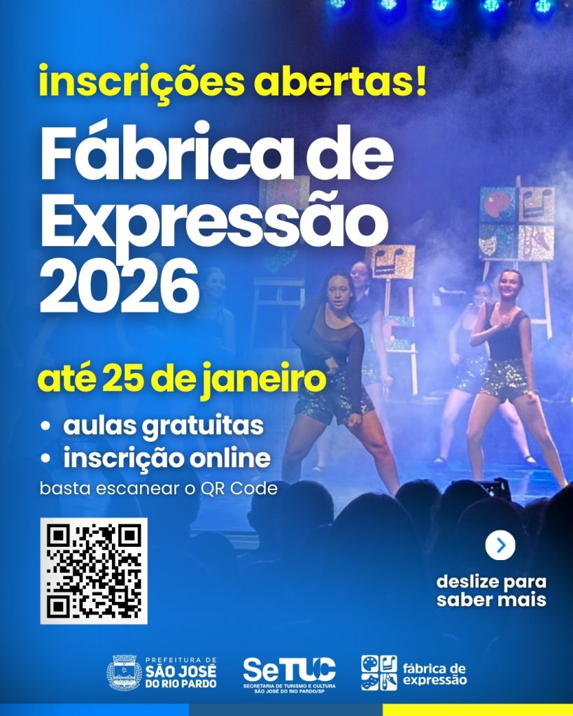 A Fábrica de Expressão, espaço de fomento à cultura gratuito no município, informa que está com matrículas abertas às aulas em diversas modalidades artísticas, gratuitas, cujas inscrições poderão ser efetuadas até dia 25/01.