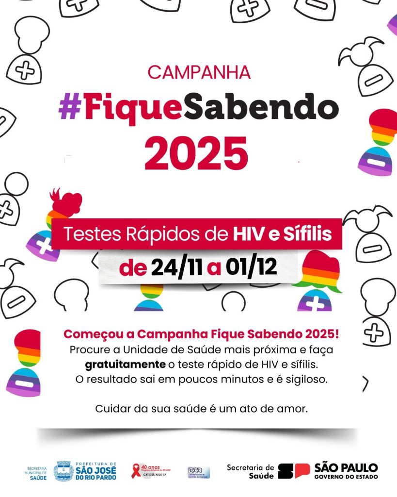 A Campanha “Fique Sabendo”, promovida em alusão ao Dezembro Vermelho, que incentiva ao diagnóstico precoce de HIV e de Sífilis iniciou segunda-feira, 24/11, e acontecerá até dia 01/12 em São José do Rio Pardo.