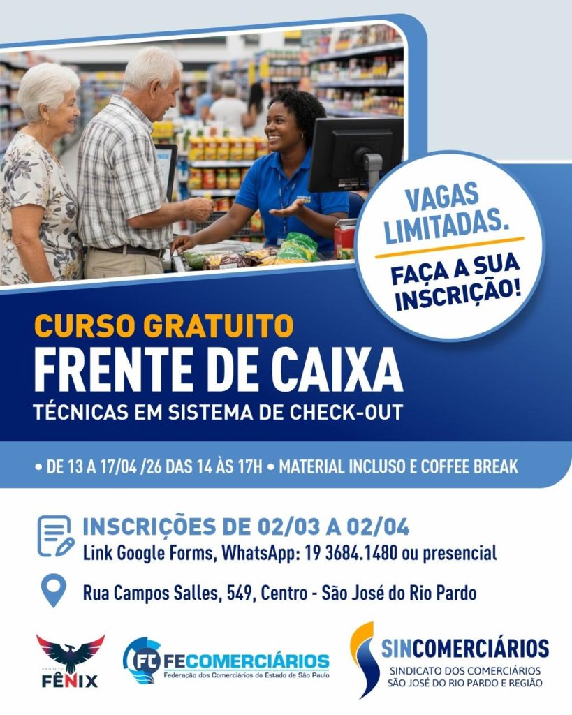 O Sindicato dos Comerciários de São José do Rio Pardo e Região oferece mais uma oportunidade para quem busca qualificação ao mercado de trabalho. Com iniciativa da Fecomerciários, por meio do Projeto Fênix, idealizado pelo presidente Luiz Carlos Motta, o Sincomerciários promoverá em abril o curso de Frente de Caixa com Técnicas em Sistema Check-Out.