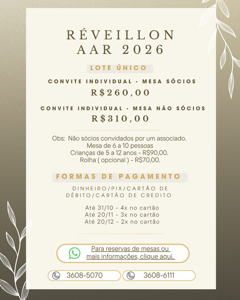 A Associação Atlética Riopardense divulgou, nestes últimos dias, detalhes de como será sua tradicional festa de Réveillon, marcada para a noite de 31/12, informando, também, que o clube já está comercializando convites ao esperado evento, que promete ser um dos mais marcantes do tricolor, para brindar a chegada de 2026 em grande estilo.