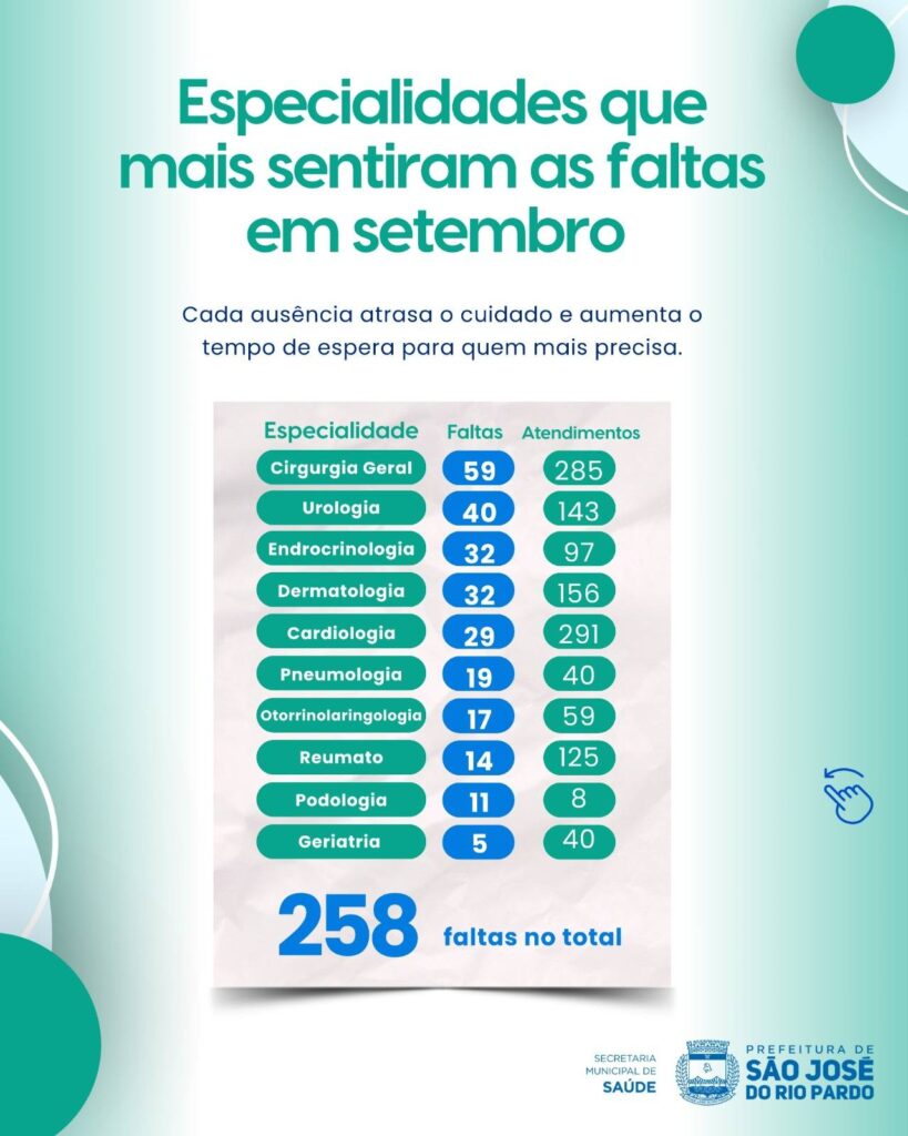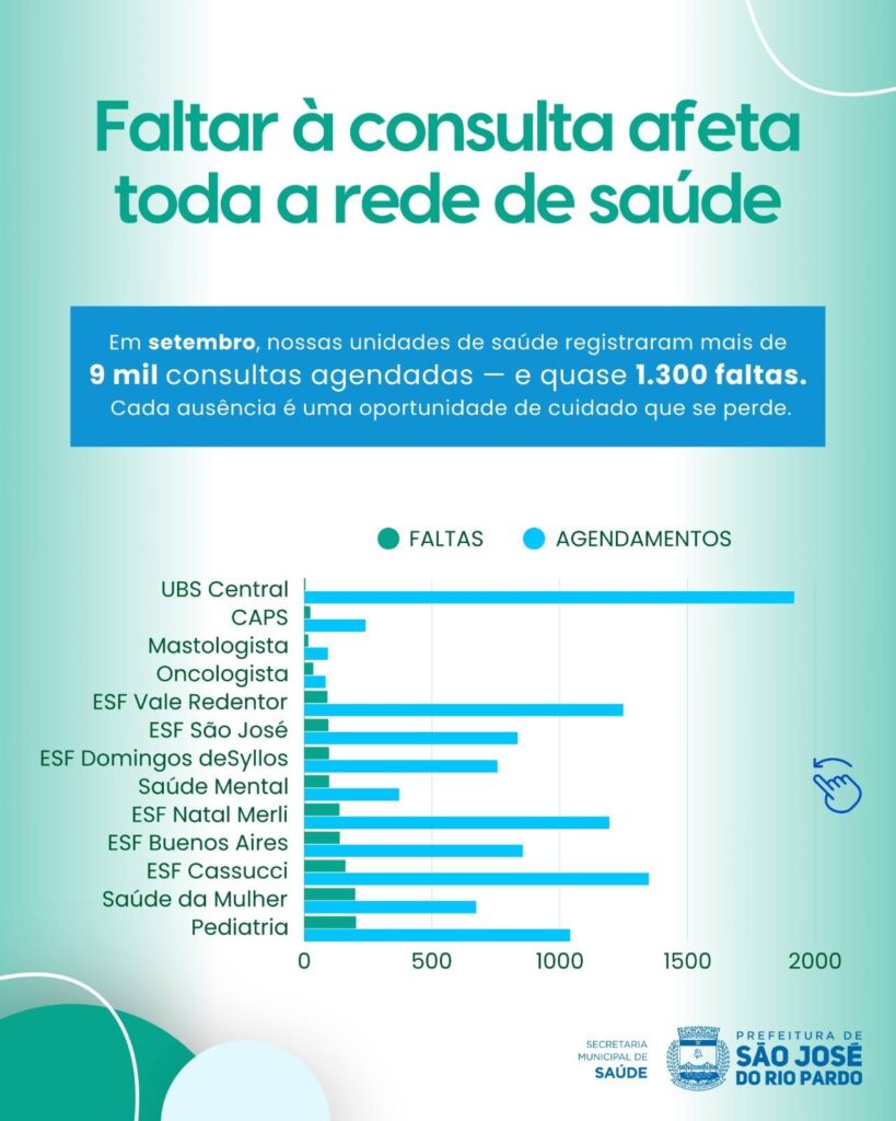 Ainda, de acordo com a nota, em setembro, as Unidades de Saúde do município registraram mais de 9 mil consultas e mais de 1.300 faltas, sendo a maior parte delas apontadas na Saúde da Mulher, na Pediatria e nas ESFs Cassucci e Natal Merli, conforme mostra o quadro abaixo.